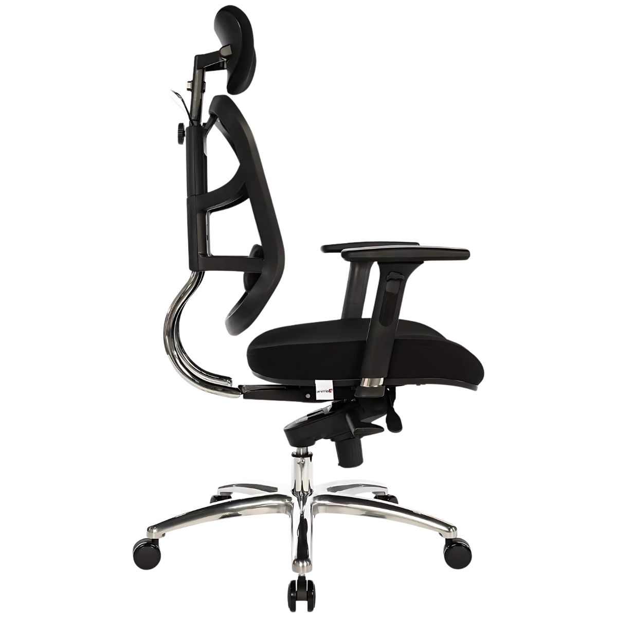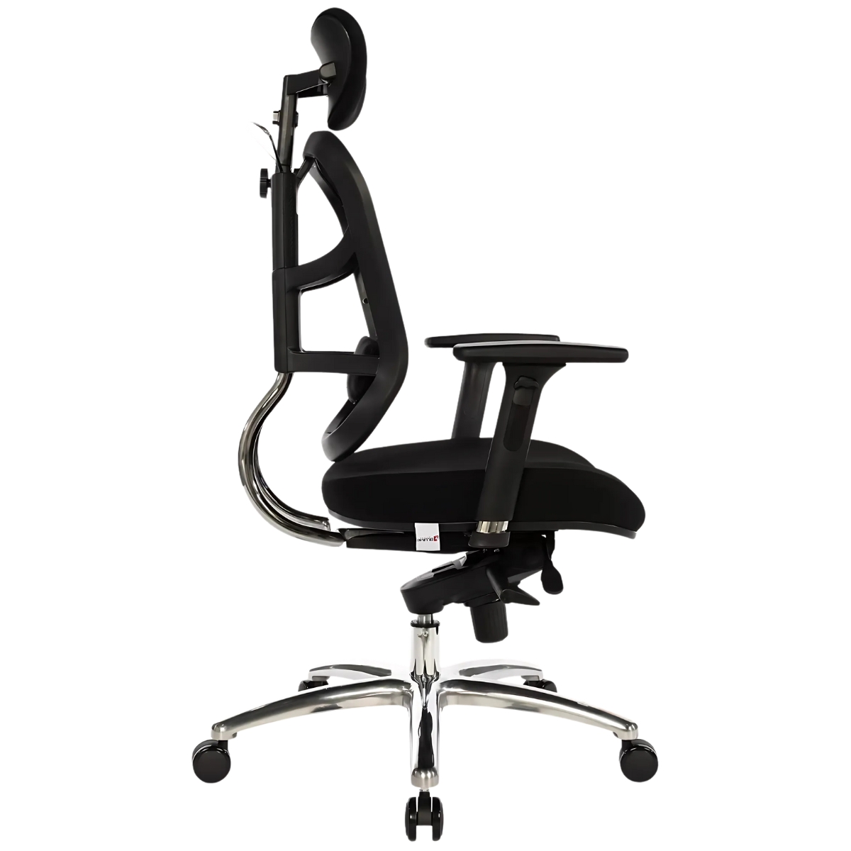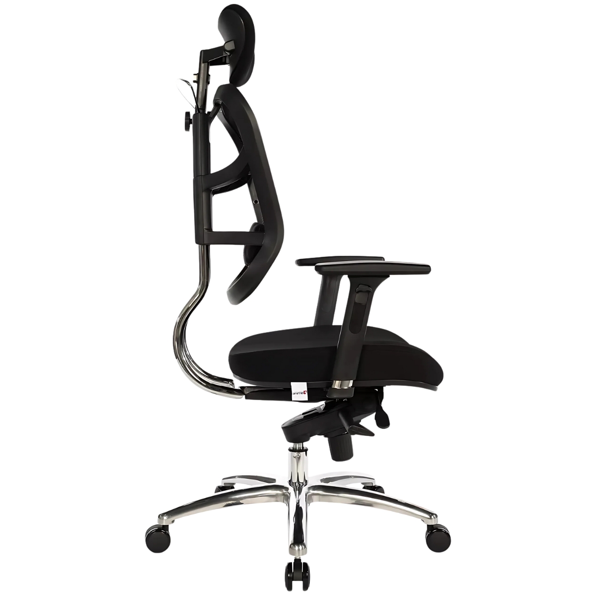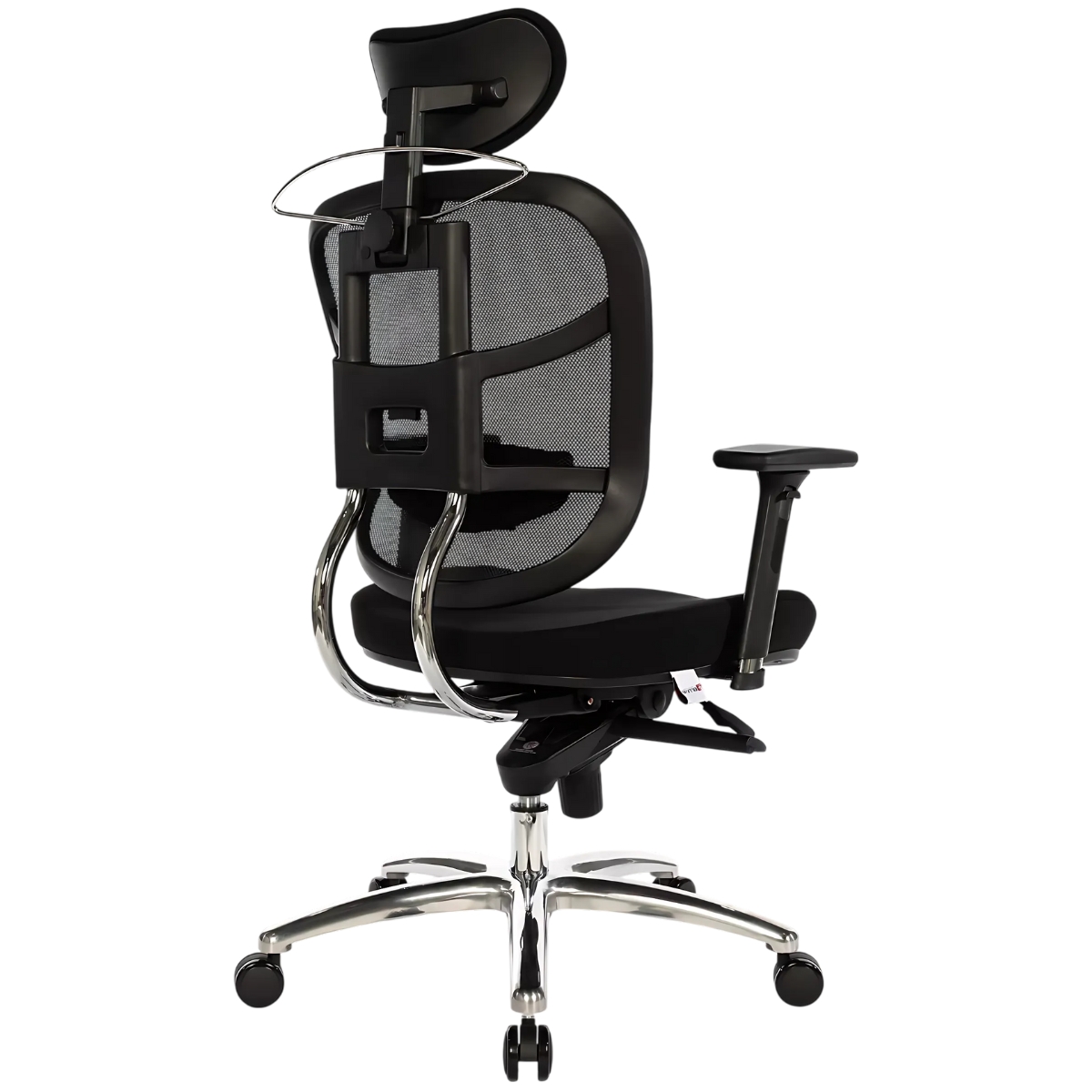 Encosto em tela de poliéster com regulagem de altura por sistema de catraca com 6 posições de travamento e tensor lombar