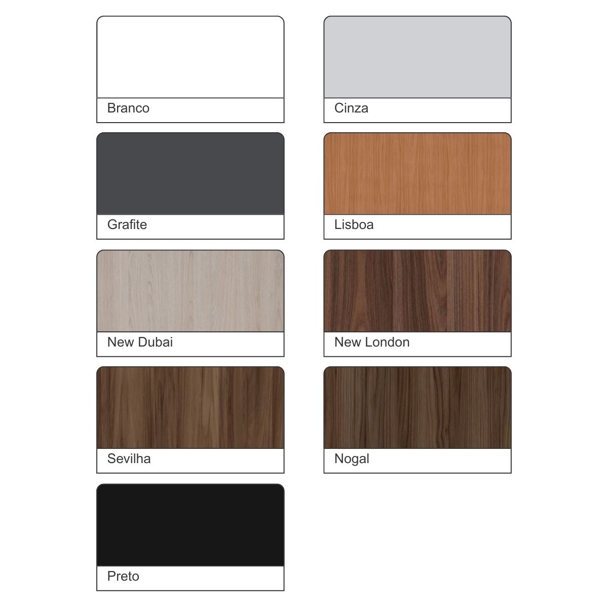 Opções de cor do tampo: Branco – Cinza – Grafite – Lisboa – New Dubai – New London – Sevilha – Nogal – Preto