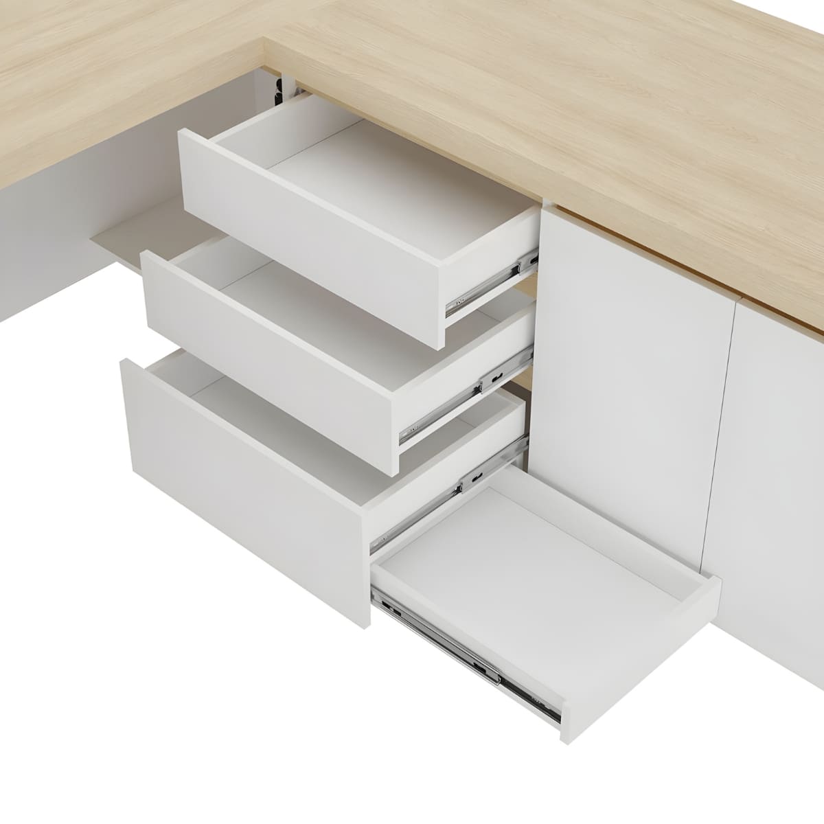 Quatro gavetas com trilhos telescópicos, sendo uma gaveta oculta na gaveta maior
