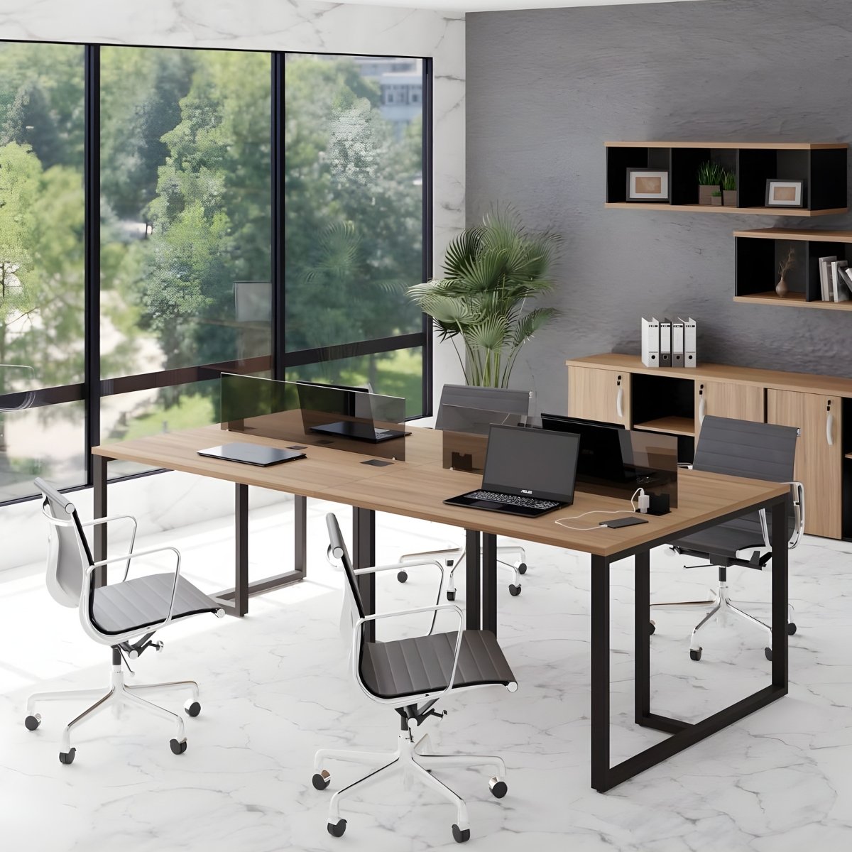 A Plataforma de Trabalho Industrial Berlim é uma solução componível que permite criar estações de trabalho amplas, organizadas e totalmente adaptáveis às necessidades da equipe. Seu design modular facilita a montagem de composições alinhadas, garantindo funcionalidade, privacidade e integração visual no ambiente corporativo. Ideal para escritórios dinâmicos que buscam praticidade, durabilidade e um layout versátil para otimizar o dia a dia.
